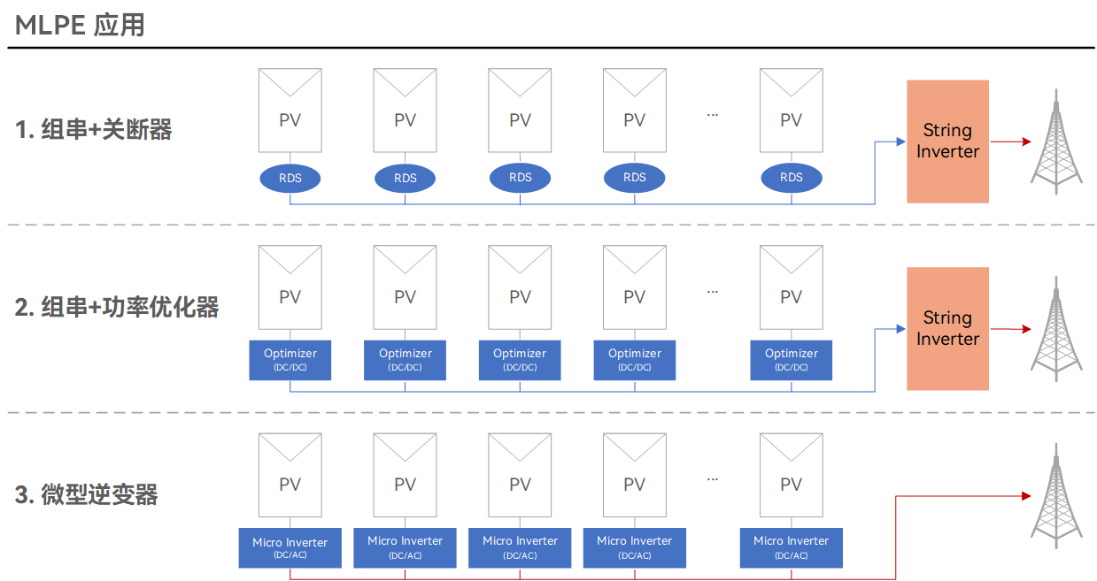 MLPE (Module Level Power Electronics) 組件級電力電子,是指一類能夠對電能進行精細化控制的電力電子器件,包括關斷器、功率優化器、微型逆變器等。目前MLPE已在分布式光伏市場中得以廣泛應用,主要發揮著對單個或幾個光伏組件電力進行逆變、關斷、監控、功率優化等功能的作用。