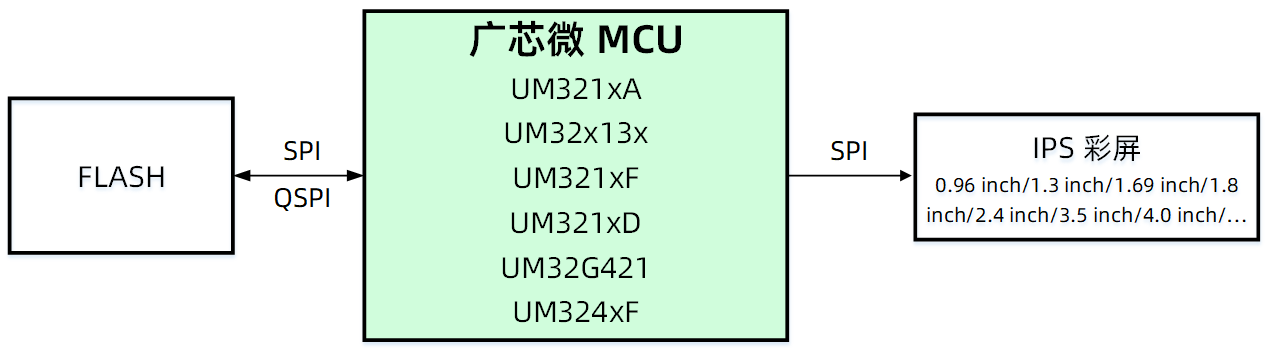 廣芯微IPS彩屏解決方案搭載廣芯微的MCU,通過普通SPI接口(或者QSPI接口)讀取外部FLASH存儲的圖片、動畫數據,再通過另外一路SPI驅動彩屏。對于0.96 inch到4 inch不同尺寸的彩屏,客戶可以選擇廣芯微不同規格的MCU來實現理想的刷屏效果,系統硬件框圖如下: