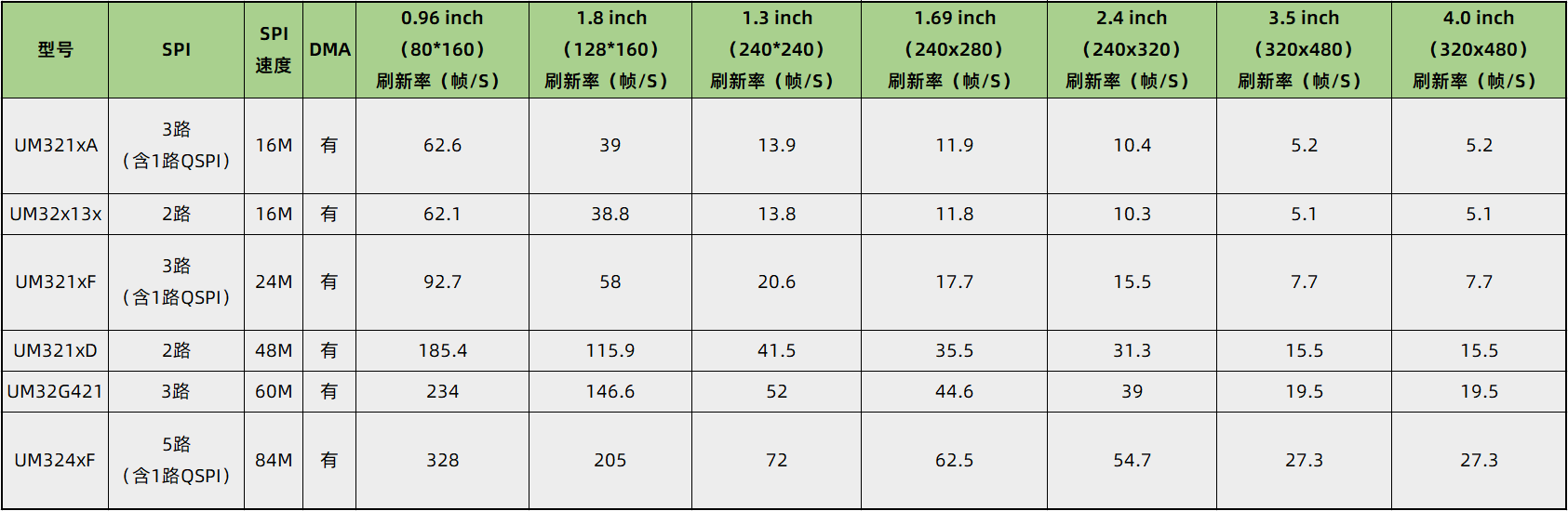 廣芯微推出一系列MCU 彩屏解決方案,接口資源和彩屏刷新率性能如下表所示(圖片、動畫數據存儲在外部FLASH):