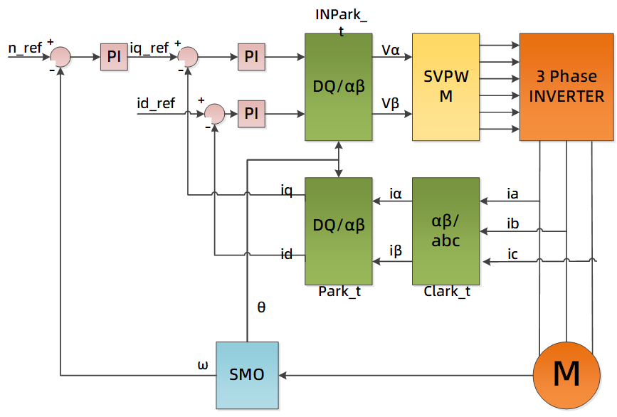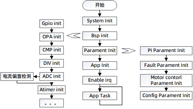 電機(jī)控制部分主要在高頻中斷中執(zhí)行運(yùn)算,主要處理FOC運(yùn)算部分,及位置速度觀測器。ADC中斷主要處理采樣數(shù)據(jù),低頻中斷主要處理速度/功率外環(huán)控制部分及故障檢測部分。
