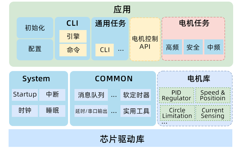 此方案整個軟件工程分為應用層、System、Common及電機庫。應用層包含系統初始、系統配置、CLI引擎、通用任務、電機控制API、電機任務等。System層包含Startup啟動、中斷服務、時鐘、睡眠與低功耗等。Common層包含消息隊列、軟定時器、延時/串口輸出、實用工具等。電機庫包含PID 環路、換相函數處理、芯片驅動庫等。