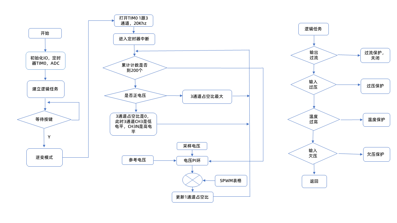 以上為逆變器系統軟件流程圖。而在系統控制上,前級用一對互補PWM信號控制,后級用兩對互補PWM信號控制。