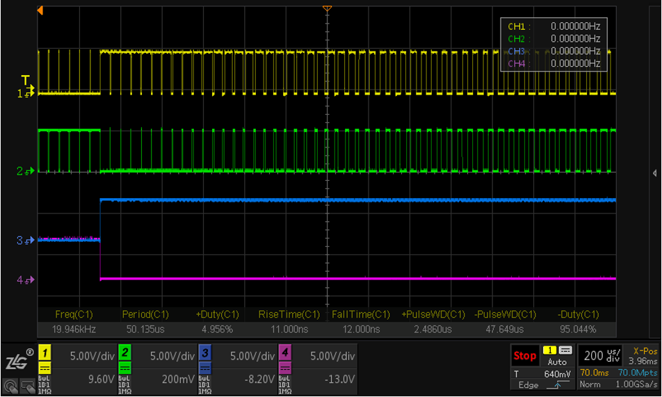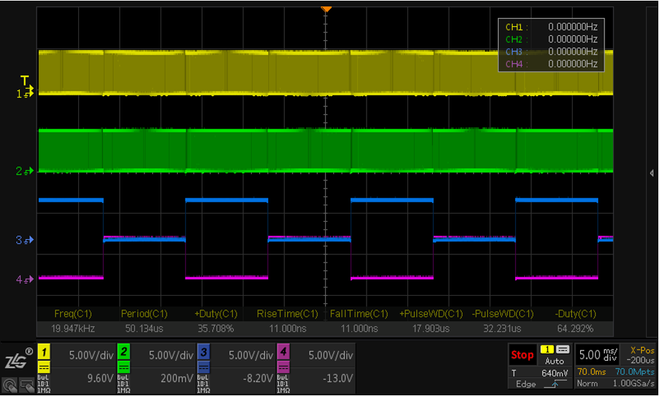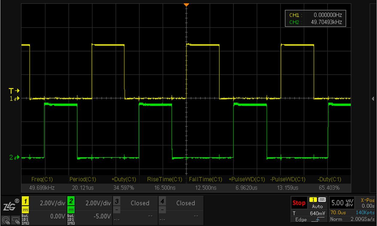 電路使用兩個開關管N2和N4,兩個開關管在外部激勵方波信號的控制下交替導通和截至,在變壓器T1次級繞組得到方波電壓,12V輸入經整流濾波得到約350V的直流電壓,驅動信號如下圖。