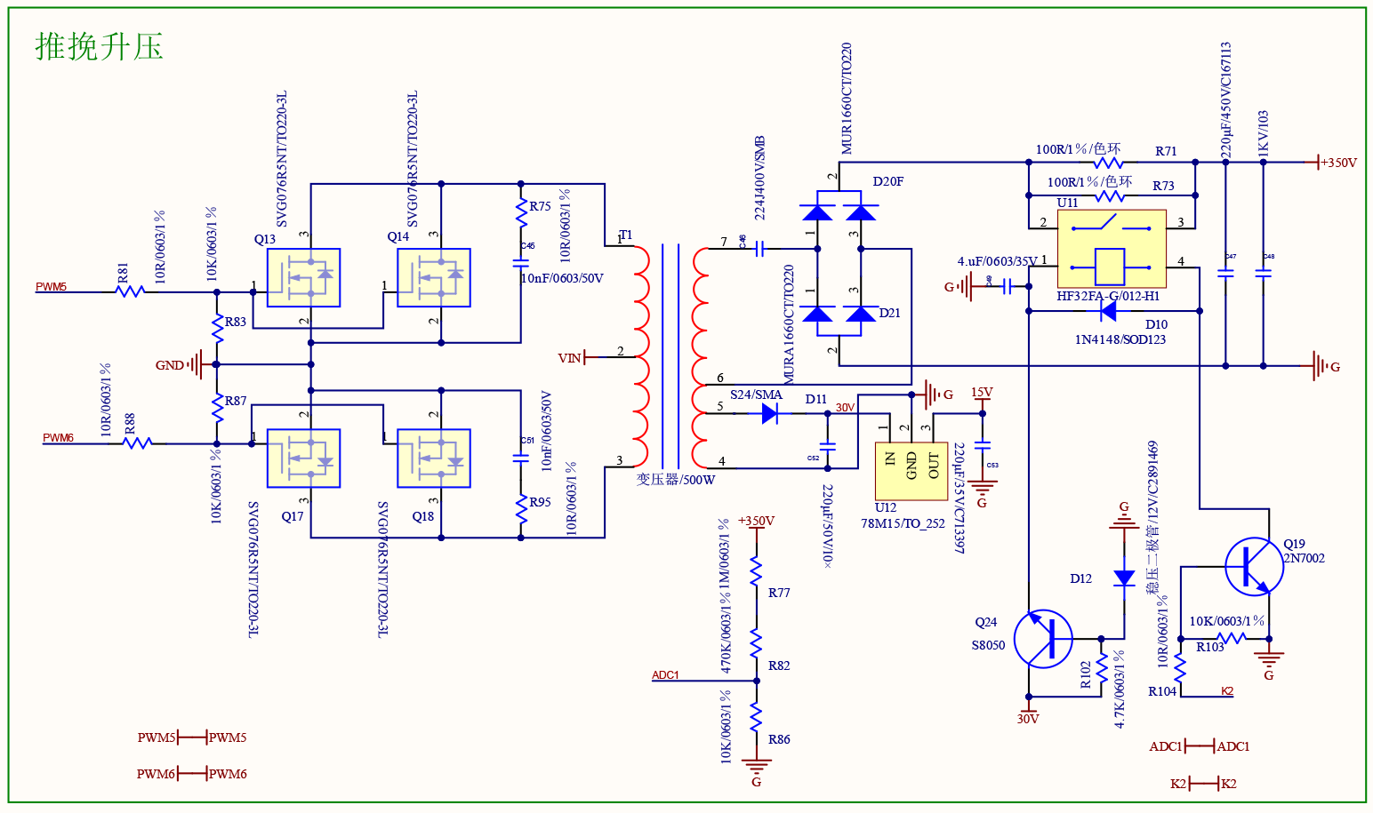 方案采用前級升壓+后級逆變架構,輔助電路包括輸入過壓/欠壓保護、輸入過流保護、輸出過壓/過流保護等,前后級功率及控制通過變壓器和光耦隔離,技術實現的關鍵是推挽升壓和全橋逆變的控制。