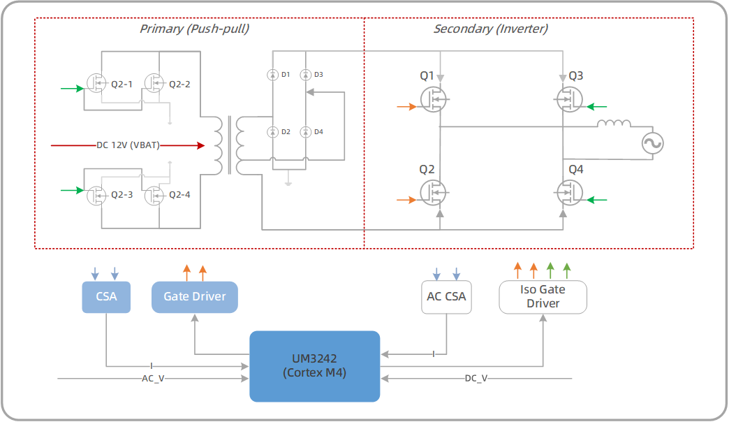 逆變電源是指將直流電源轉換為交流電源的裝置。隨著光伏發電的推廣,汽車和車載電器數量的增加,儲能系統的快速發展、微型逆變器及UPS的廣泛應用,逆變電源的應用場合也越來越多,成了電力電子技術中不可缺少的部件。而傳統逆變電源基于模擬元件的設計,沒有可編程的能力,使得逆變電源的可擴展能力差,沒有顯示功能等問題。因此使用高性能MCU作主控的數字電源被越來越廣泛的應用,本文介紹廣芯微UM3242F-RET6主控芯片實現DC-AC逆變數字電源方案。