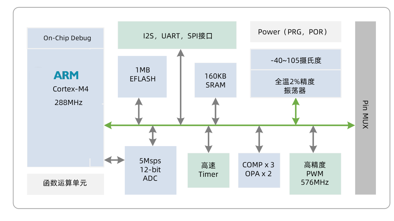 高性能主控處理器UM324xF集成Cortex M4內核,最高主頻可達288MHz, 配備1MB Flash及 160KB SRAM存儲器,支持多通道ADC采樣接口,多路高分辨率PWM,以及多種增強型外設接口,強大的性能和豐富的接口為一系列可擴展的數字電源平臺提供了強大的應用支撐。