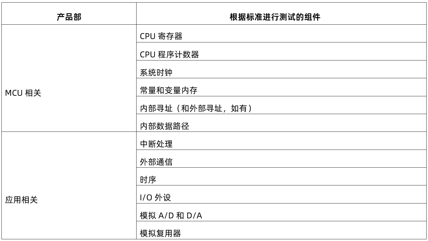 針對微控制器,必須在B類標準依從性下測試的MCU部件如下: