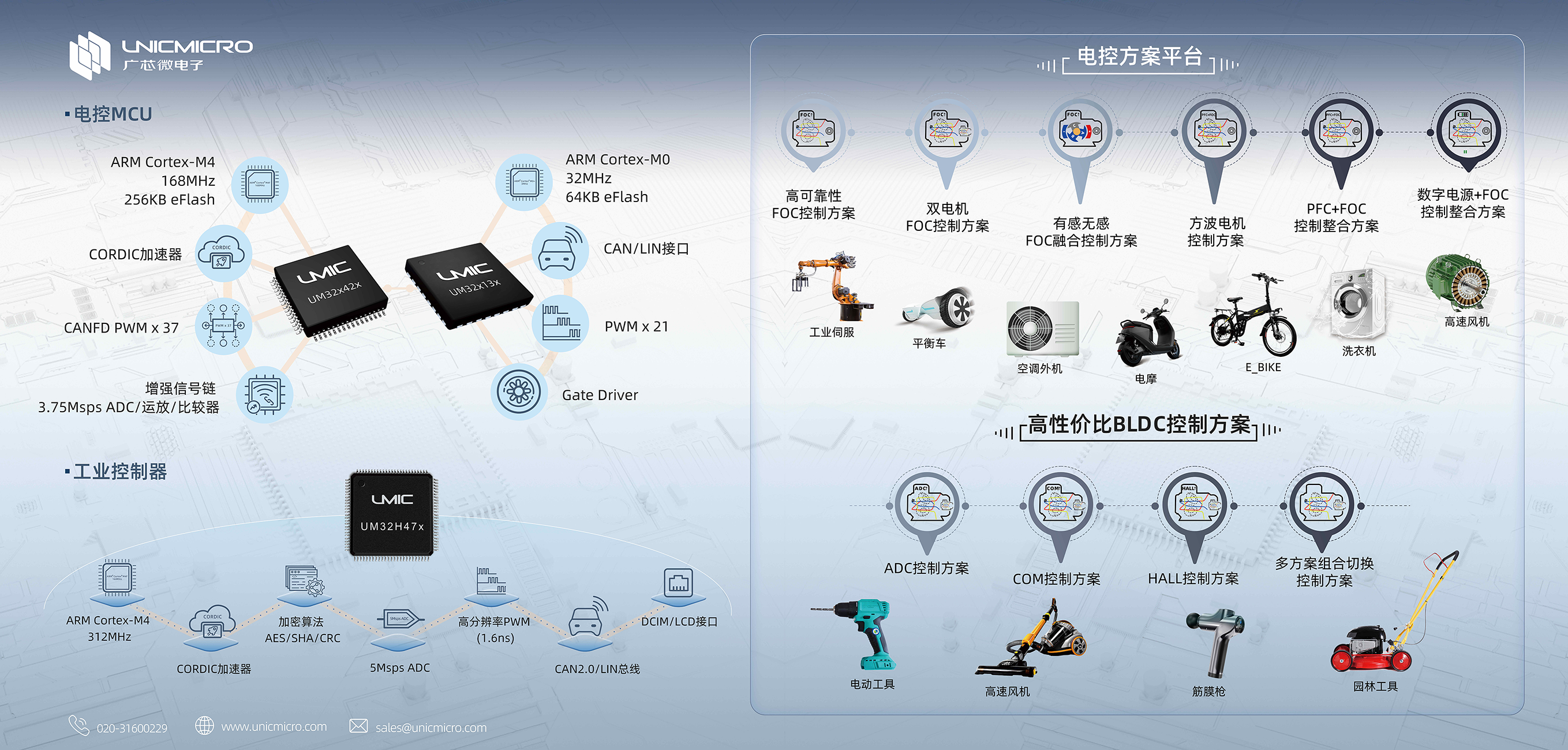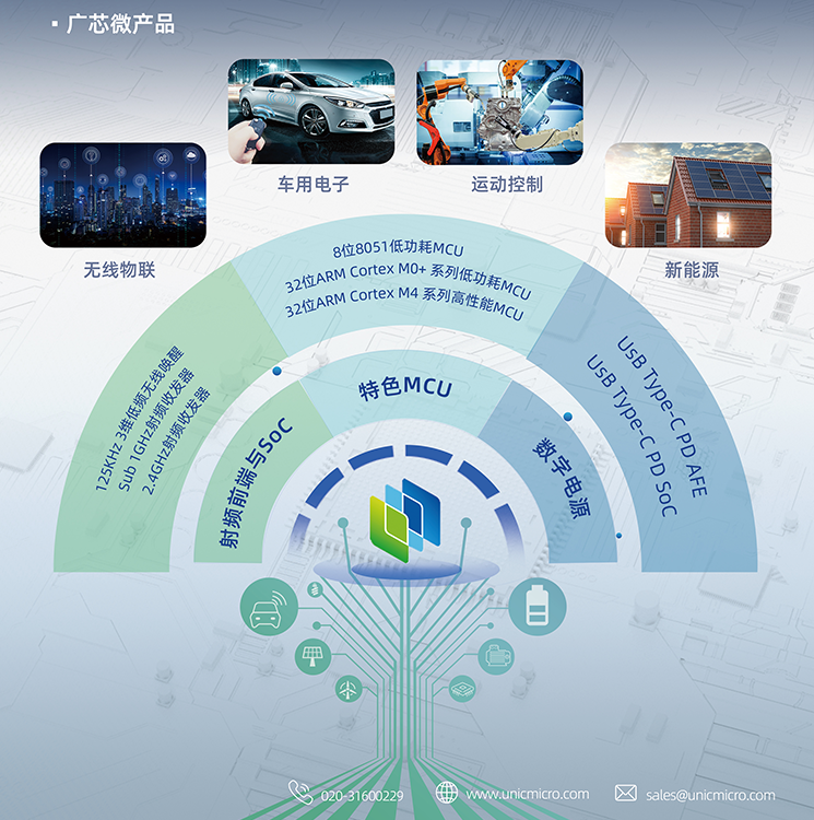 廣芯微電子(廣州)股份有限公司是一家致力于面向新能源、變頻電機控制及低功耗物聯網等領域為客戶提供創新芯片及其解決方案的集成電路設計企業,其產品包括極具特色的8位/32位微控制器芯片、無線射頻收發器芯片、快充與數字電源管理芯片等。廣芯微獨有的低功耗芯片設計方法、高效率的變頻電控技術、大功率的PD快充協議以及多樣性無線連接技術整合而成創新與差異化的集成電路設計,在健康醫療電子、消費電子、智慧家庭、工業控制、傳感器與表計等領域已經得到了廣泛的應用。