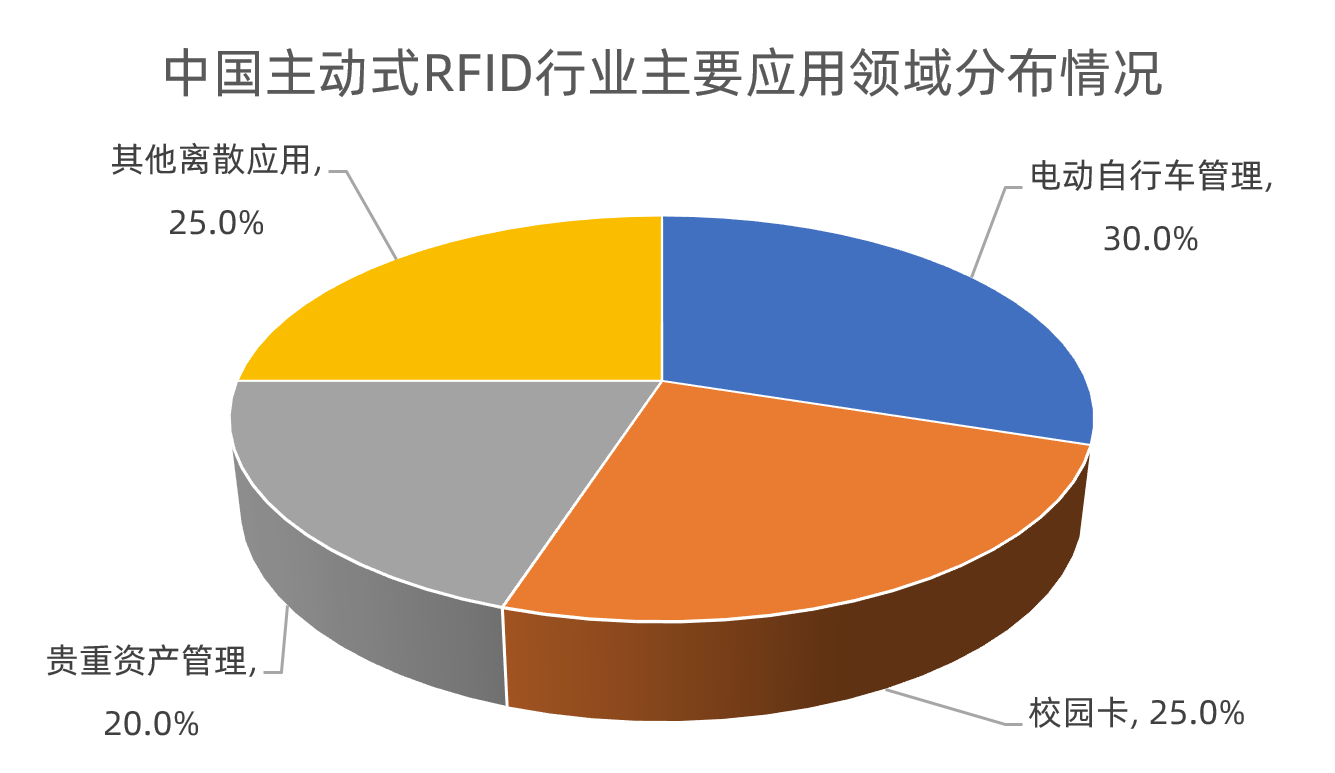 根據物聯傳媒公布的數據顯示,近幾年我國主動式RFID整體出貨量每年大約3000萬,市場產值為數十億元,其最主要的應用有校園卡、電動自行車管理、貴重資產管理以及其他的零散應用,尤其校園卡應用與電動自行車管理是有源RFID最為集中的應用場景。根據物聯傳媒發布的數據顯示,在主動式RFID主要應用領域中,電動自行車管理領域應用占比達30%,校園卡應用占比為25%,貴重資產管理領域應用占比為20%。