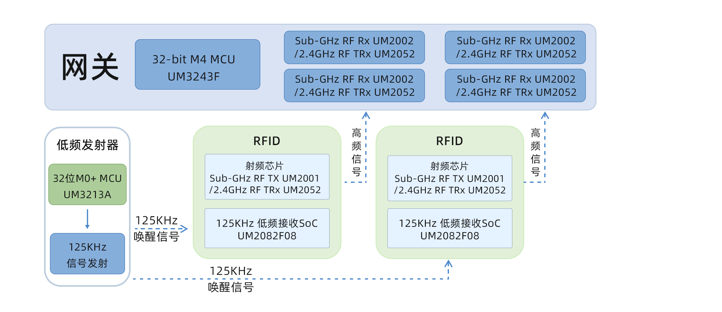 此方案使用低頻125KHz通訊頻段觸發,有效觸發距離為5-10m,使用高頻433MHz頻段或者2.4GHz頻段傳輸數據,其有效通信距離為1.3km(433MHz發射)或100m(2.4GHz發射),整體方案具有智能雙向通信系統,無需人工干預,可以方便構成用于校園、醫院、物流控制等場景的應用系統,適用于人員及物品管理、室內定位等應用。